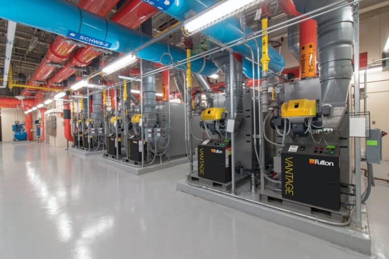 While the older boilers were around 80% efficient, the six new Fulton VTG boilers, as fully condensing boilers, achieve efficiencies up to 99%.