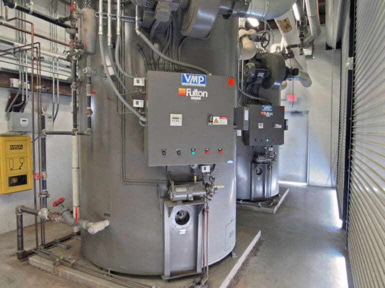 The two Fulton VMP-150 (Vertical Multi Port) boilers installed are dual-fired to burn diesel fuel as backup (required by code for redundancy) if natural gas is not available.